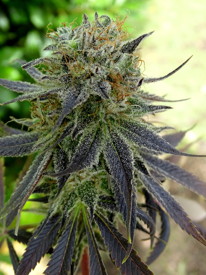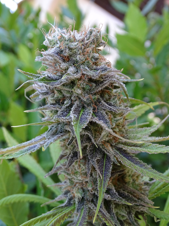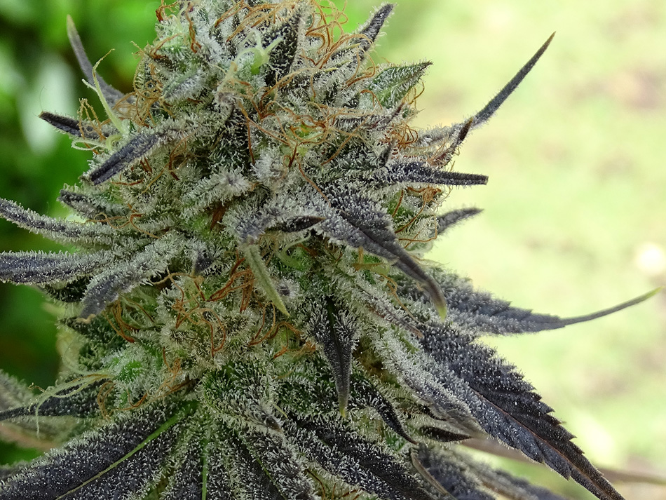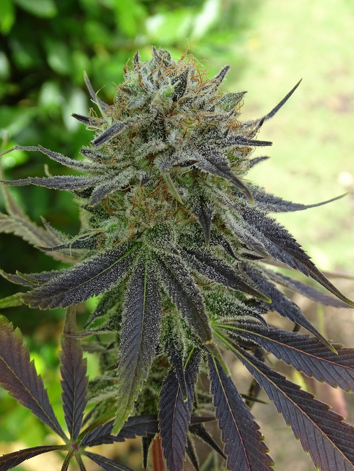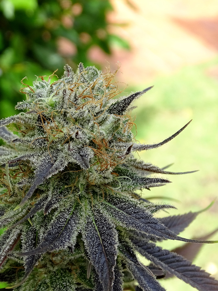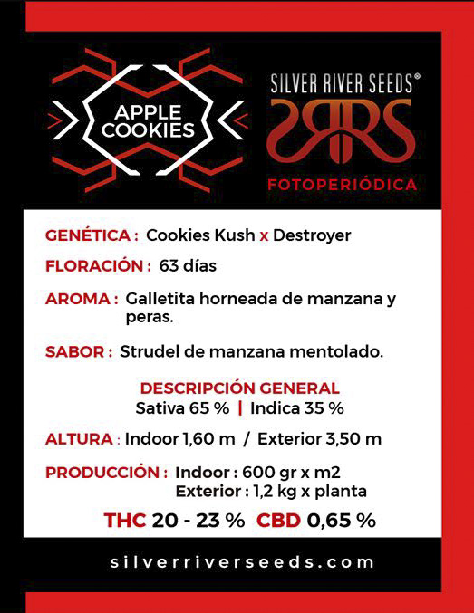 Apple Cookies es un híbrido para enamorarse y jamás dejar de cultivar. Creada para adaptarse a indoor combina su envidiable estructura enramada con enormes cogollos hiper-nevados sin demorar demasiado en flora. Genéticamente lleva OG Kush Rolex y un touch de Durban combinado con la triple sativa Thai Colombian Mexican de la Destro. El resultado es una planta monstruosa muy productora, más fácil de cultivar en exteriores ya que no tiene techo, en indoor se puede doblar el top desde pequeña o podarla una vez esquejada, ponerla a florar cuando alcanza el metro para que no supere el 1,60m también es una buena alternativa. Ambos padres rebosan de resina y eso significa hijas atestadas de entes luminosos. La Destro le aporta a la Cookies la habilidad para escapar de hongos y enfermedades relativas. Y es que ambos padres poseen enormes cogollos de piedra compactos y eso se traslada a Apple Cookies. Entrado el Otoño o bajas temperaturas suele teñirse de intensos violetas que contrastan con el claro resplandor del mar de tricomas que envuelven su vestidura. Muy bella y aromática, pomposa y exuberante, es un placer haber podido crear algo tan hermoso y deseable para disfrutar.