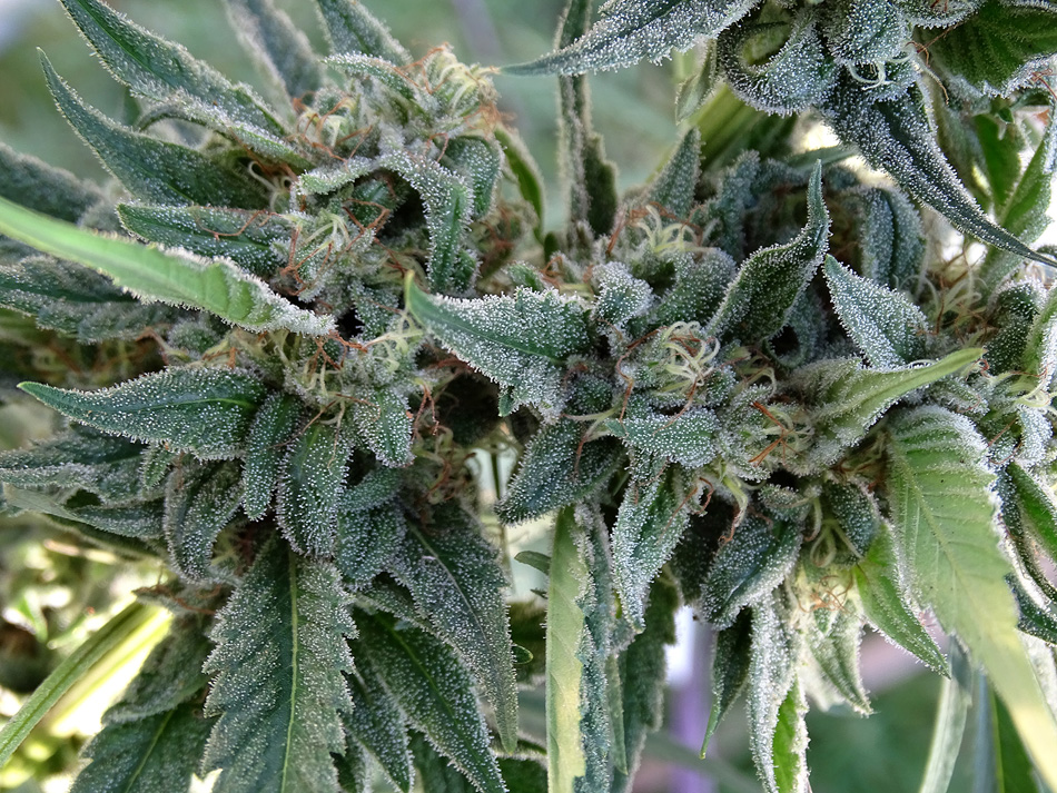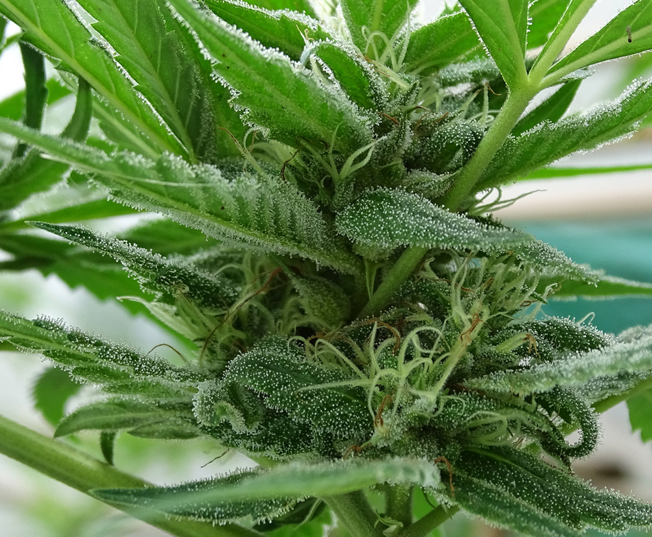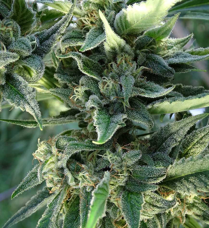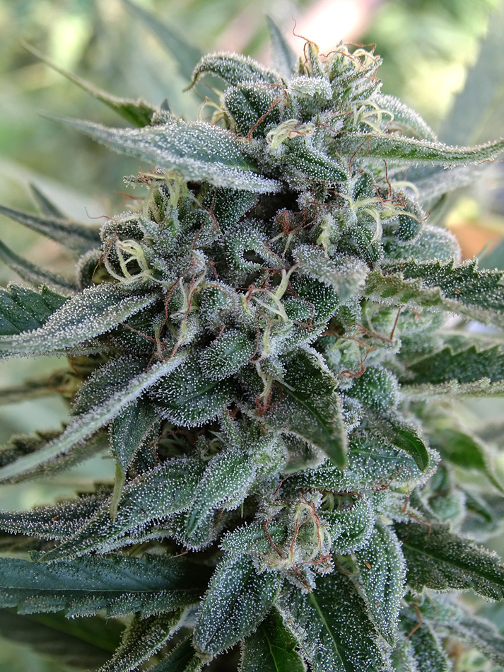 Enormes tricomas sobresalen a simple vista, como una delgada película o alfombra de gamuza que todo lo protege, recubriendo y brillando con la luz de los amaneceres. De padres muy pegadores con gen dominante ambos de producción de resina copiosa, Sour Destro golpea durísimo con mucho porcentaje de THC.