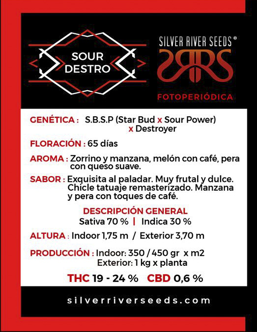 Hija de dos super campeonas ganadoras de 15 premios en Sudamérica en la última década, Sour Destro ya se ha dado el gusto de subir al podio en Uruguay 2016 por sí sola. Planta con vigor híbrido notable, S.B.S.P muy indica y arbustiva, la Destro en cambio es una Sativa alta, Sour Destro es el intermedio exacto en estructura, forma de cogollos y hojas, mix de aromas y sabores. Muy buena para indoor por sus nueve semanas de flora y su reticencia a estirarse más de lo necesario. No tiene vergüenza a la hora de producir ramaje y flores enormes con mucho de la magia de la maravillosa StarBud. El hecho de que Sour Power es mitad StarBud hace que StarBud predomine en el cruce entre ambas en un 75%. A su vez se encuentra en un choque frontal de camiones con la siempre fuerte influencia de la Destro de genes dominantes. Así y todo StarBud( indica de la costa Oeste norteamericana de origen desconocido)se las arregla para influir con dominancia en la forma de los cálices y posterior fisonomía completa del cogollo. El resultado del cruce generalmente elige la fisonomía de la flor de S.B.S.P en una planta más estilizada. Las hojas de la S.B.S.P, a pesar de ser baja de estatura y arbustiva, son alargadas con influencia sativa. Sour Destro por sumatoria presenta hojas de típica sativa. Llega a crecer mucho y superar los 3 o 4 m fácilmente en exteriores.